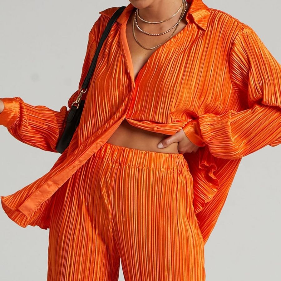 Our Fia Matching Two Piece Set is ideal for any season. The color green also makes us all happy and we love it. This flattering plisse set features a turn down v-neck collar, long bell sleeves, ruffled hems, a front button closure, a ribbed-pleated design and a high elastic waist.