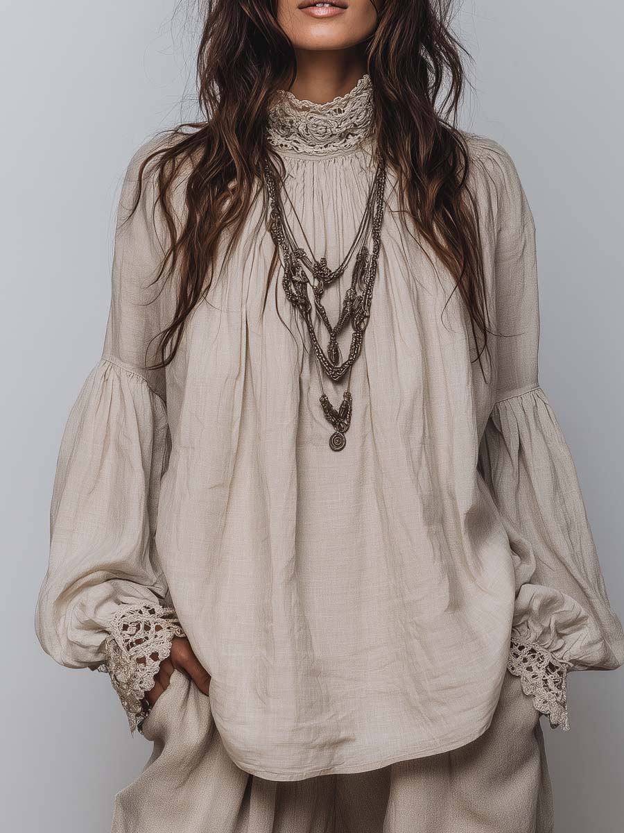Lace-trimmed Pleated Cotton Linen Blouse
