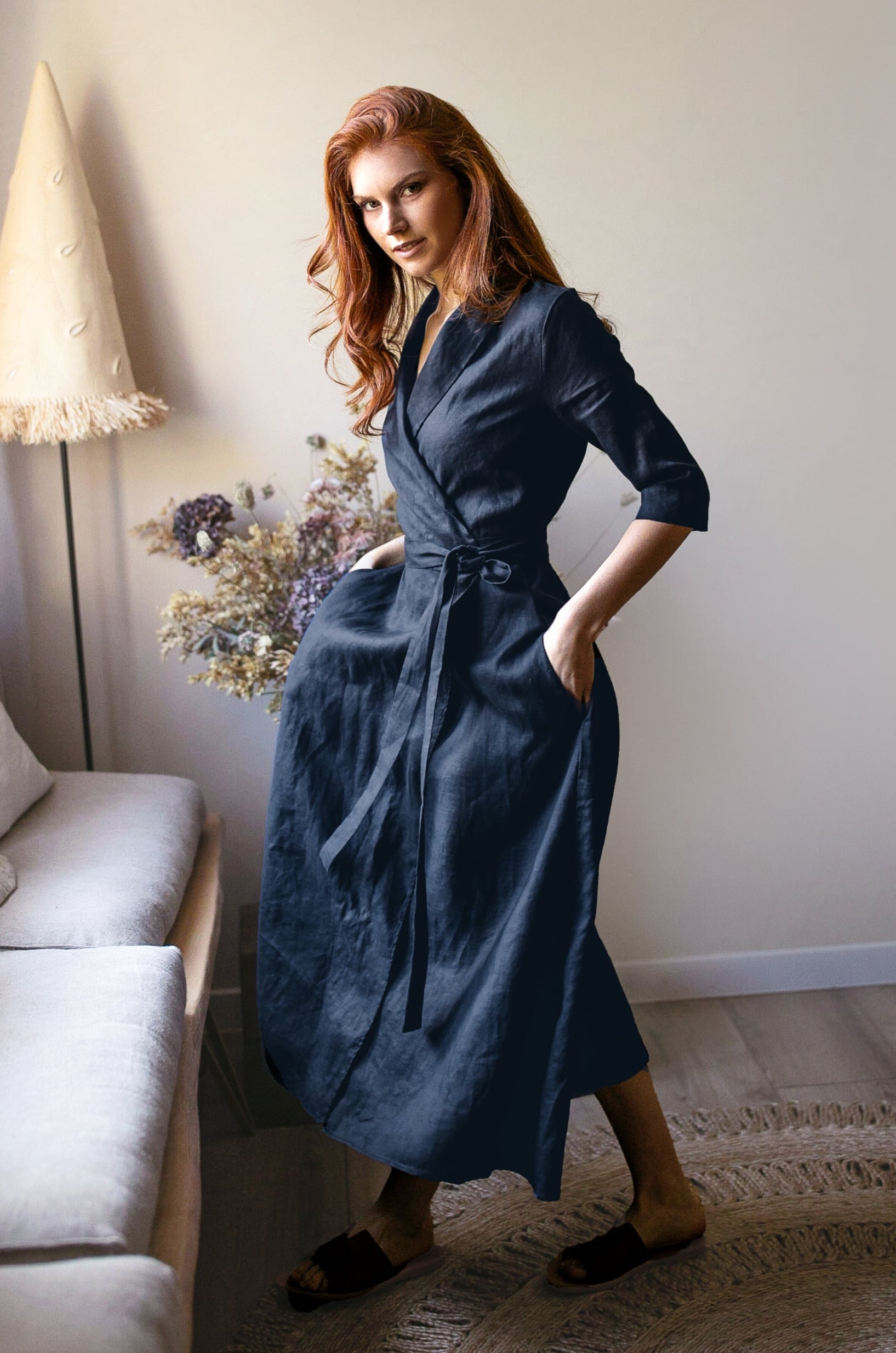 Midi Length Linen Dress with Tie Waist