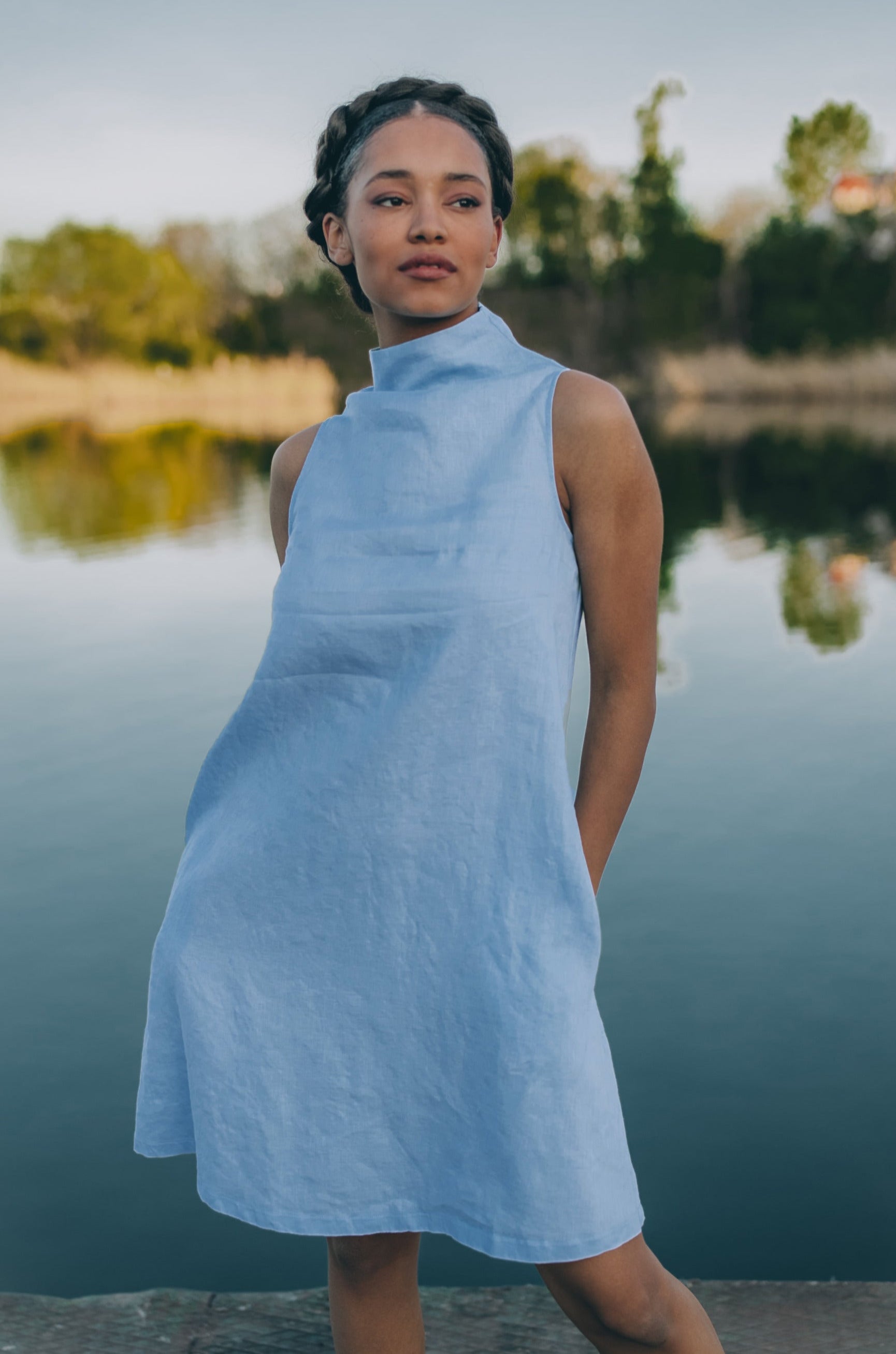 Short Linen Dress with Cowl Neck