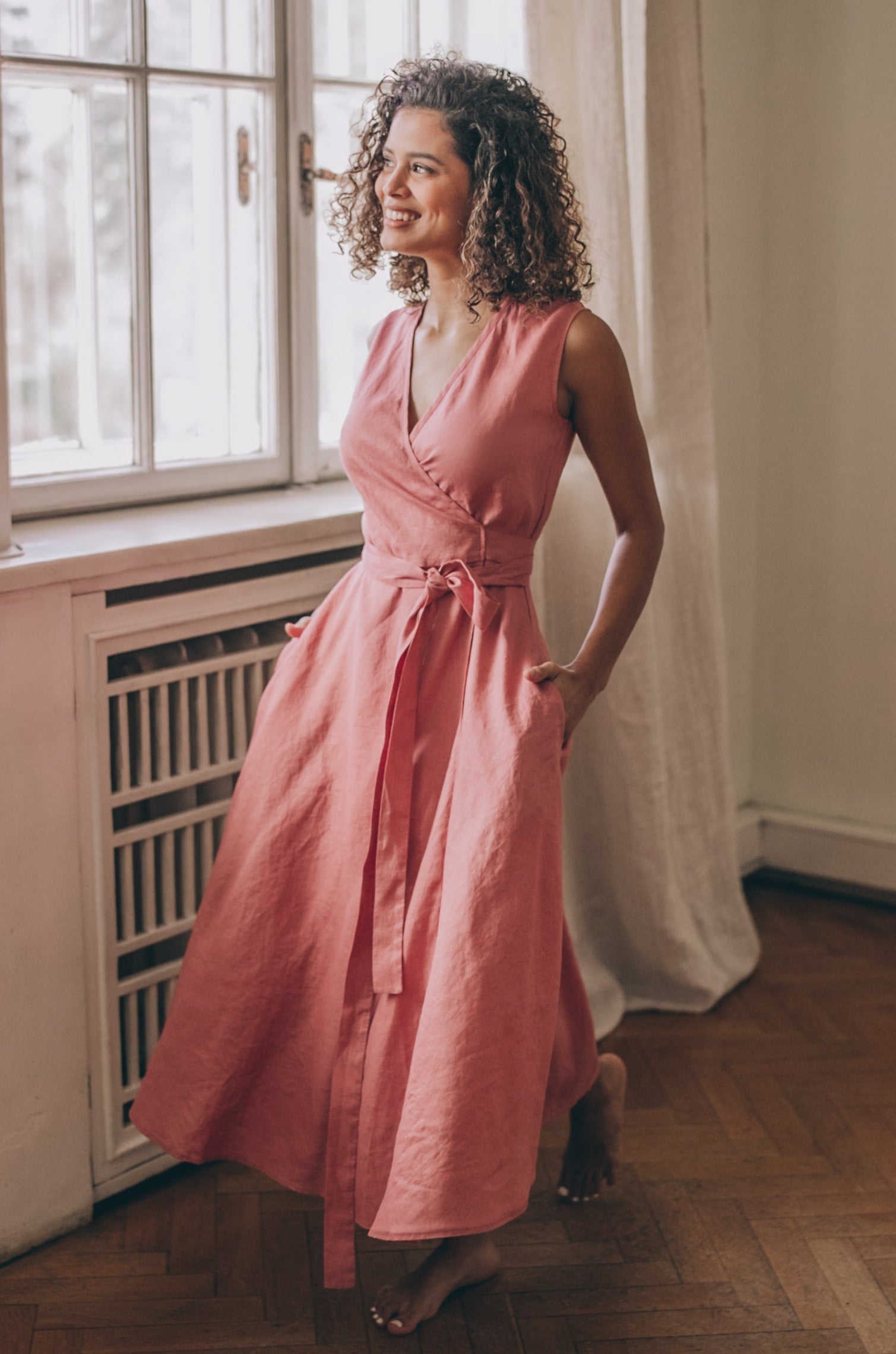 Sleeveless Linen A-Line Dress with Tie Waist