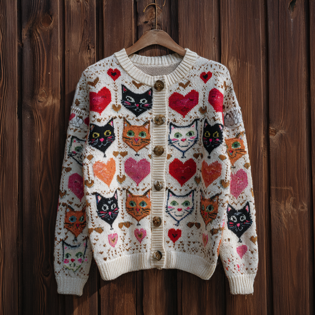 Valentine's Day Fun Cat Pattern Women's Round Neck Knit Sweater Coat