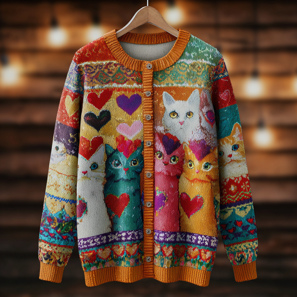 Valentine's Day Fun Cat Pattern Women's Round Neck Knit Sweater Coat