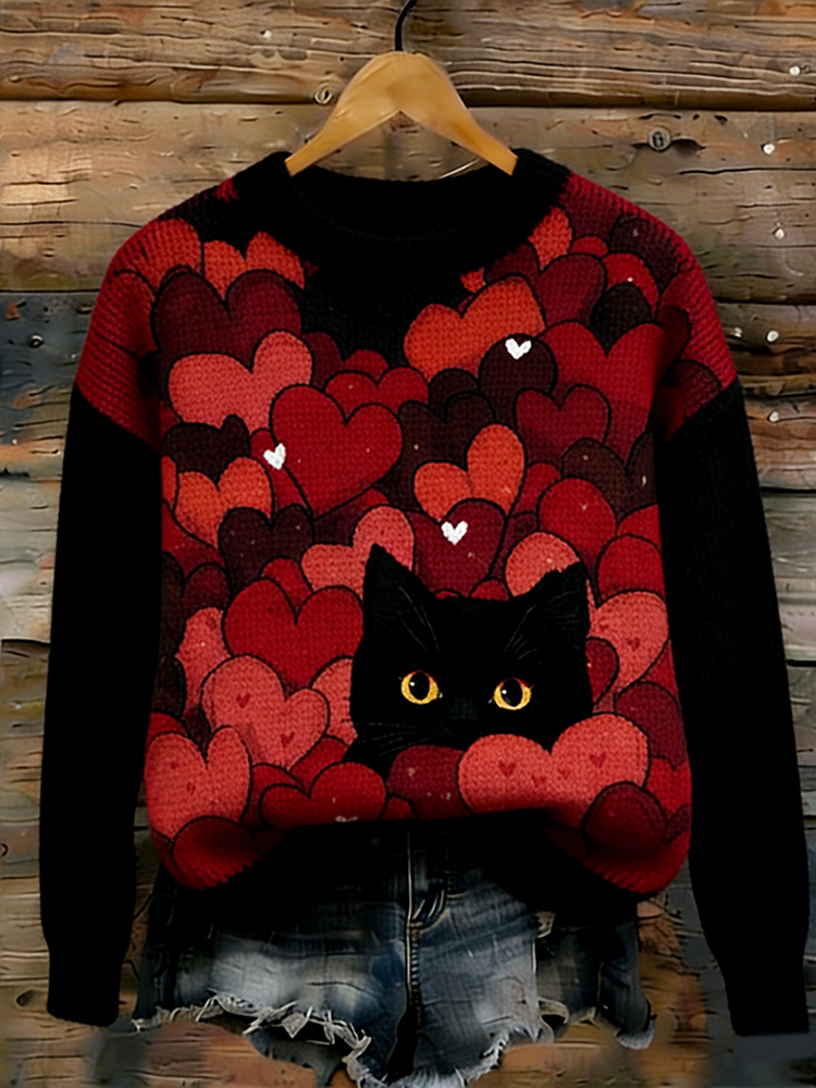 Valentine's Day Heart-shaped Cat Pattern Women's Sweater