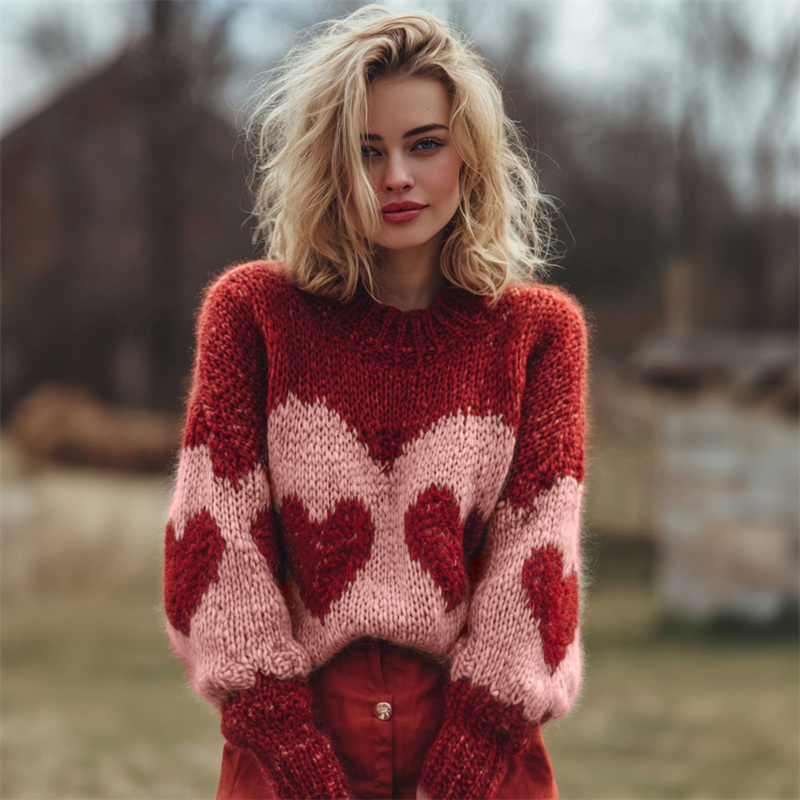 Vintage Valentine's Day Hearts Contrast Cozy Knit Sweater