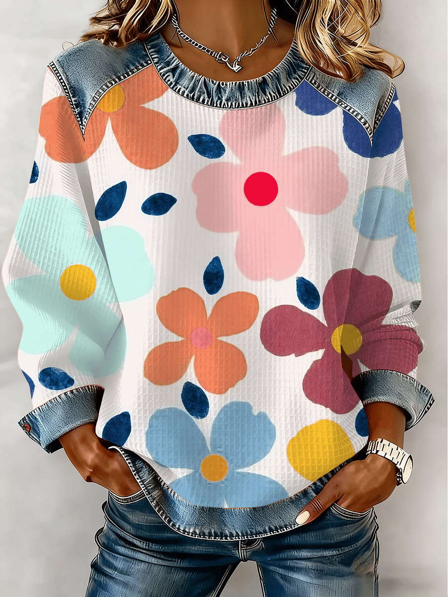 Women's Artistic Floral Print Waffle Knit Sweatshirt