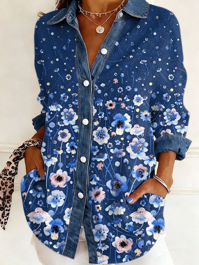 Women's Floral Print Casual Color Block Waffle Shirt