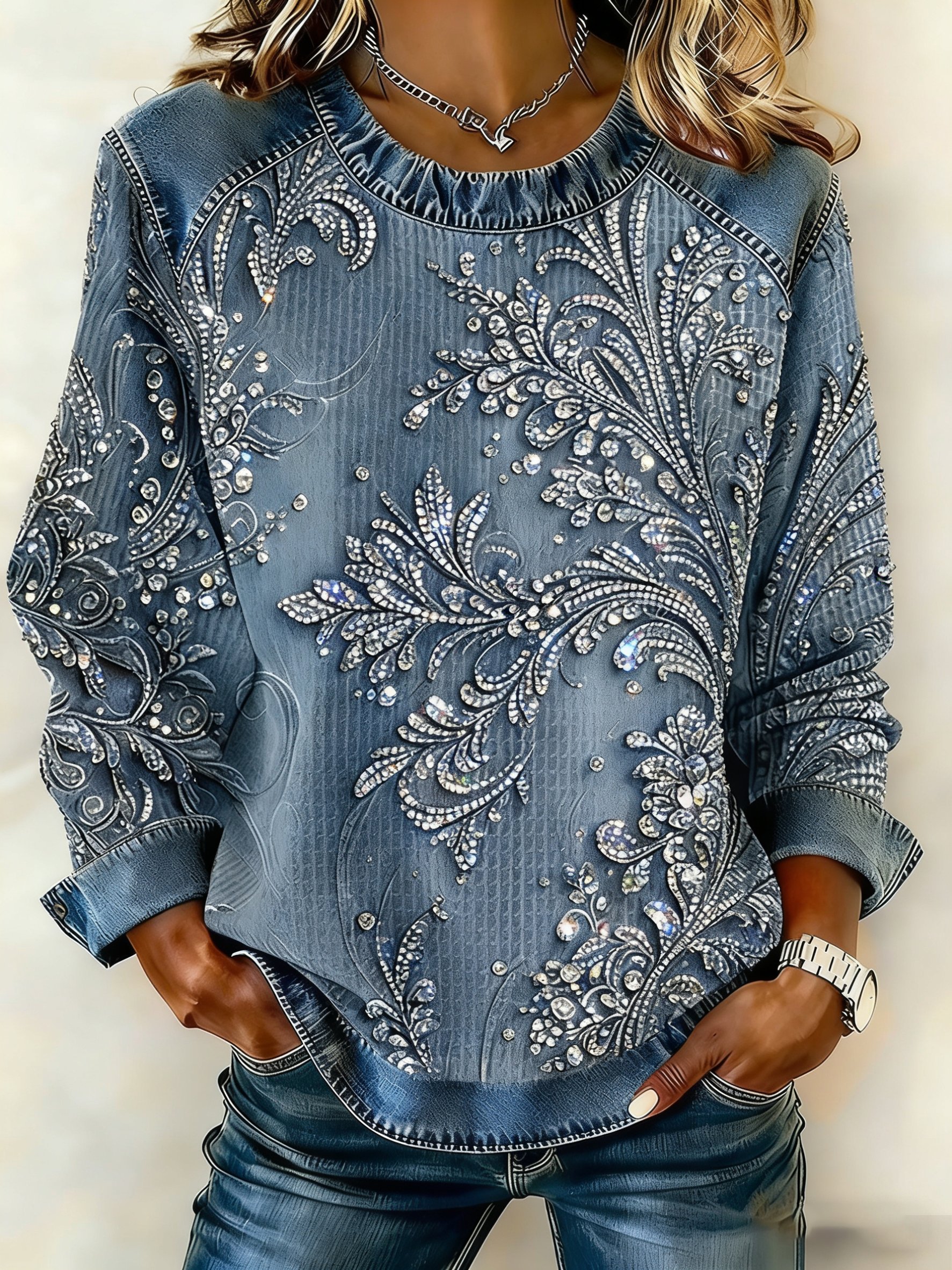 Women's Floral Print Round Neck Long Sleeve Top