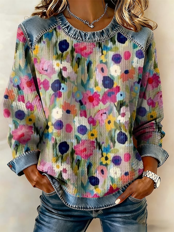 Women's Retro Botanical And Floral Art Design Print Casual Waffle-Knit Sweatshirt