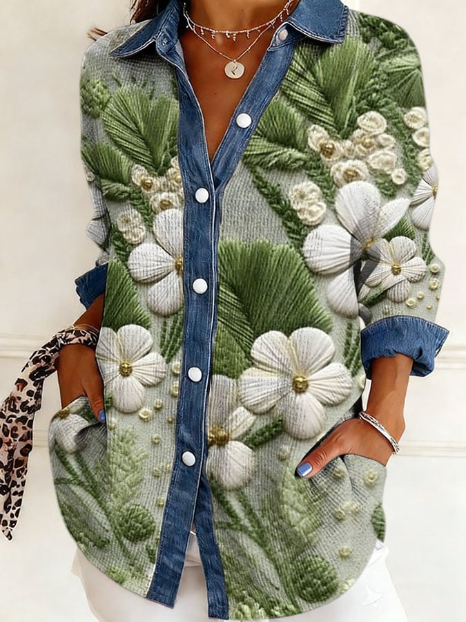 Women's Retro Botanical And Floral Patchwork Art Design Print Lapel Waffle Knit Shirt