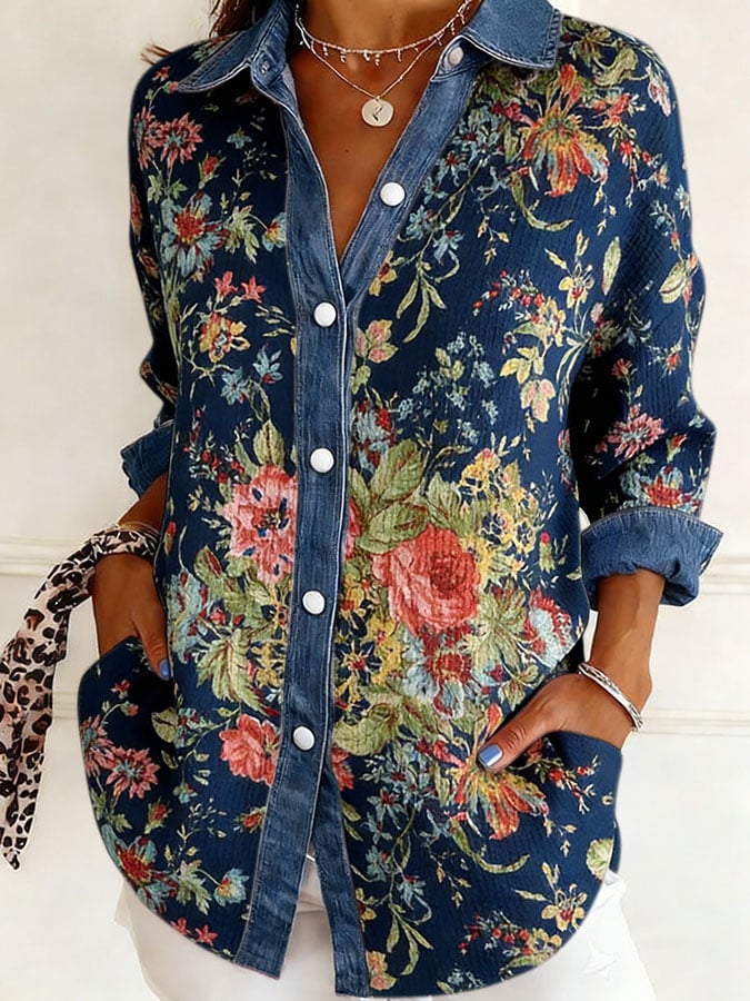 Women's Retro Floral Print Lapel Waffle Knit Shirt