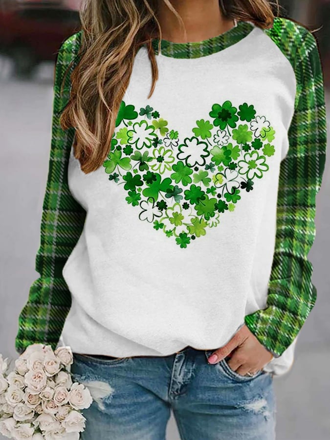 Women's St. Patrick's Day Love Heart Shamrock Plaid Print Casual Sweatshirt