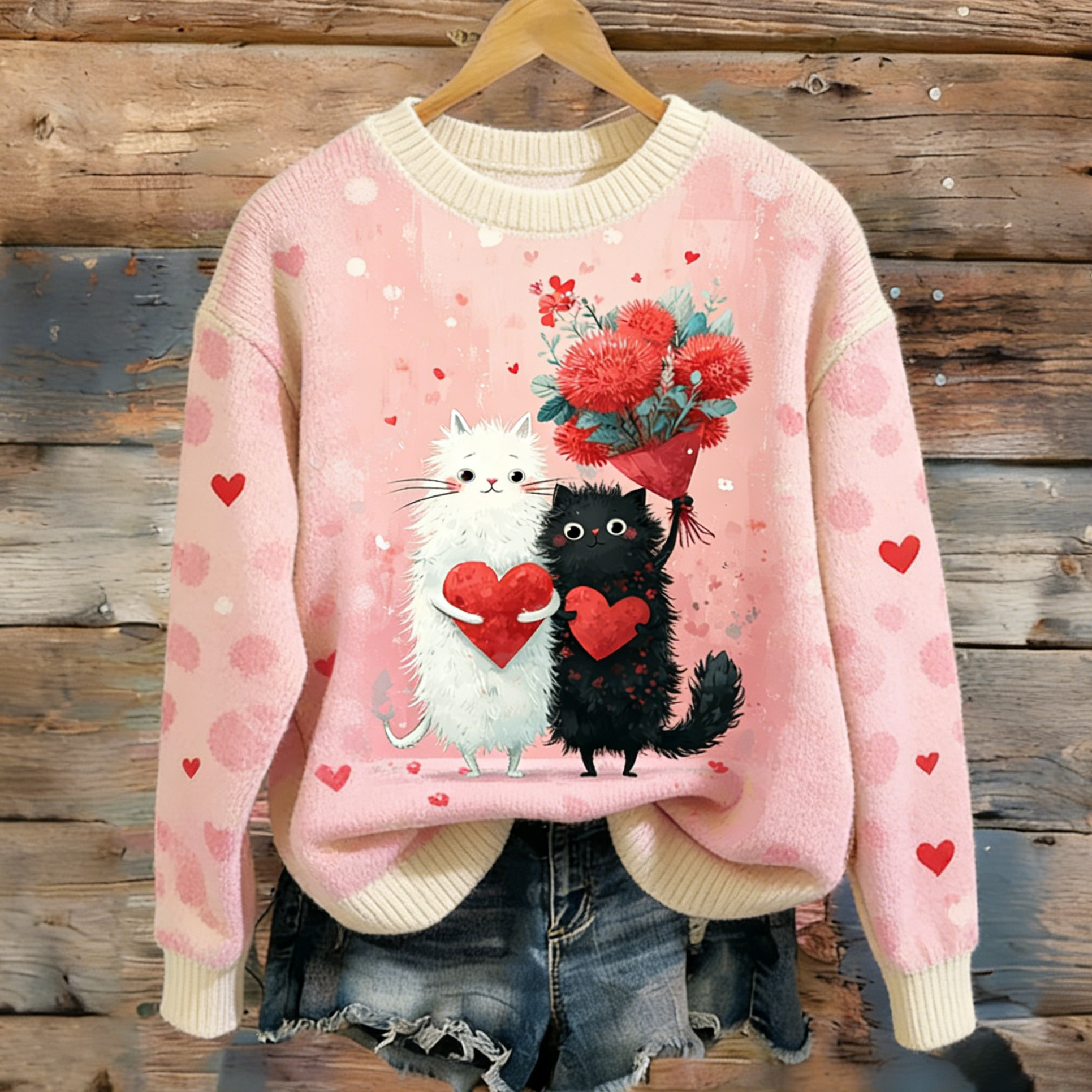 Women's Valentine's Day Cat Heart Pattern Comfortable Crew Neck Sweater
