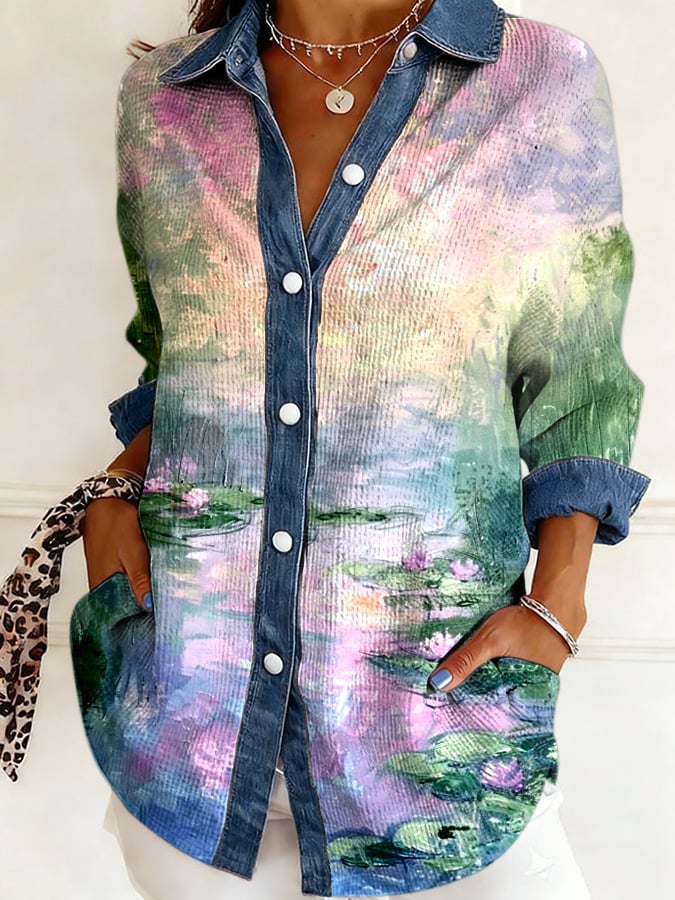 Women's Vintage Floral Print Casual Color-Block Waffle Knit Shirt