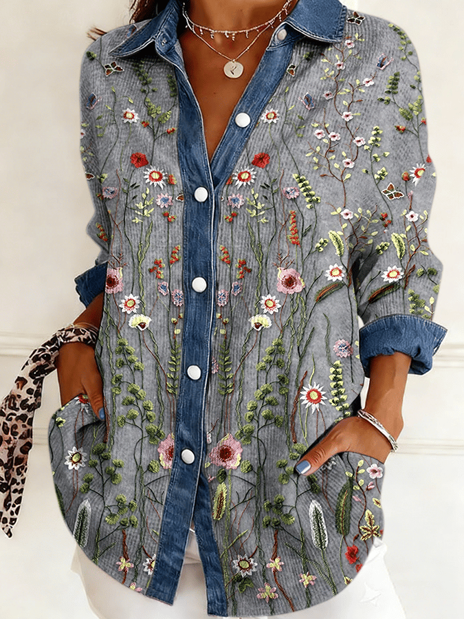 Women's Vintage Floral Print Casual Color-Block Waffle Knit Shirt