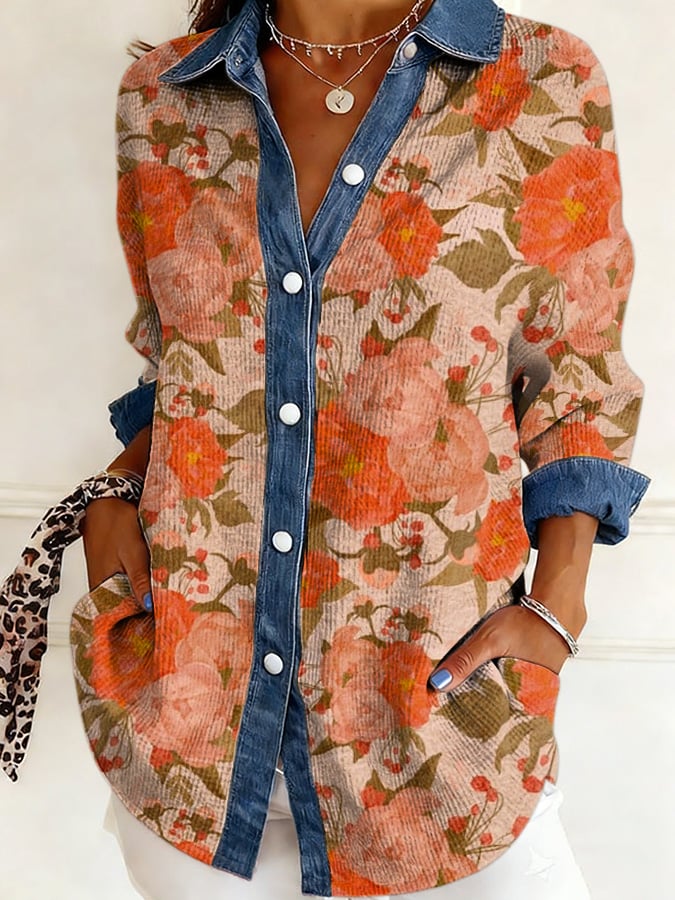Women's Vintage Floral Print Casual Color-Block Waffle Knit Shirt