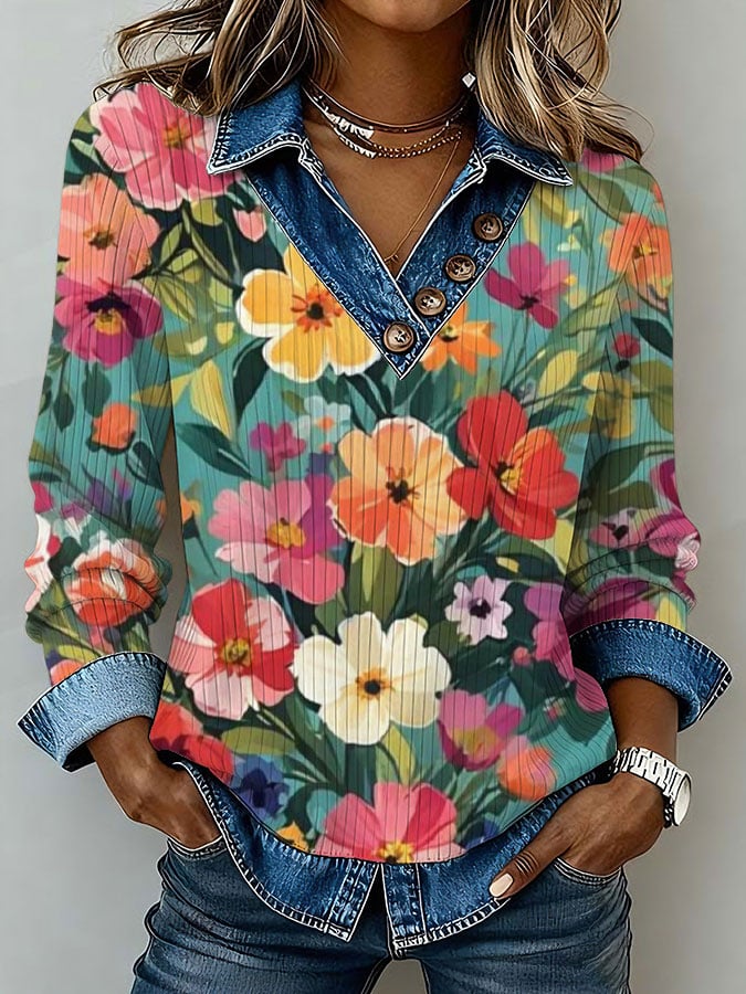 Women's Vintage Floral Printed Button Design Knit Sweatshirt