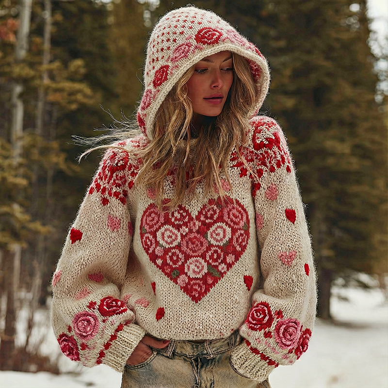 Women's Vintage Valentine's Day Heart Flower Pattern Knit Hoodie