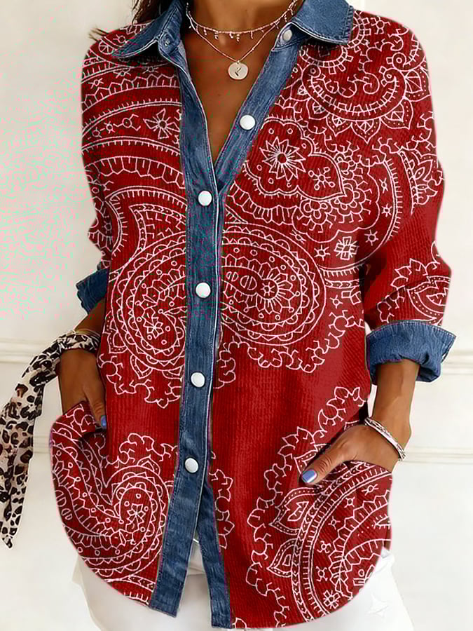 Women's Western Paisley Print Lapel Waffle Knit Shirt