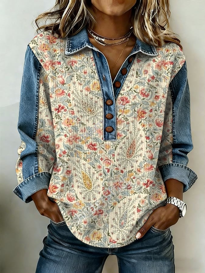 Women's Western-Style Paisley Print Lapel And Button Design Knitted Top